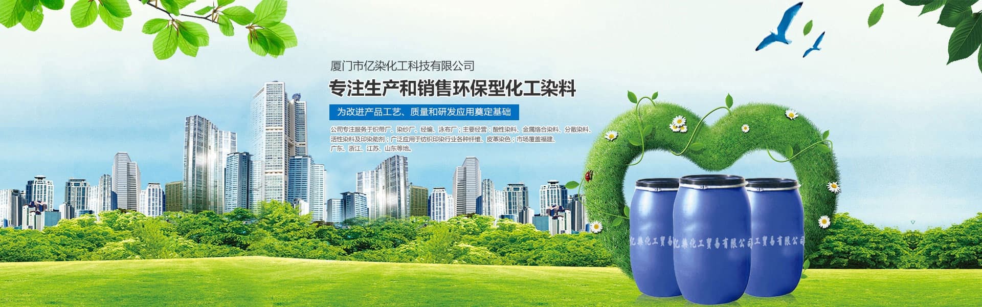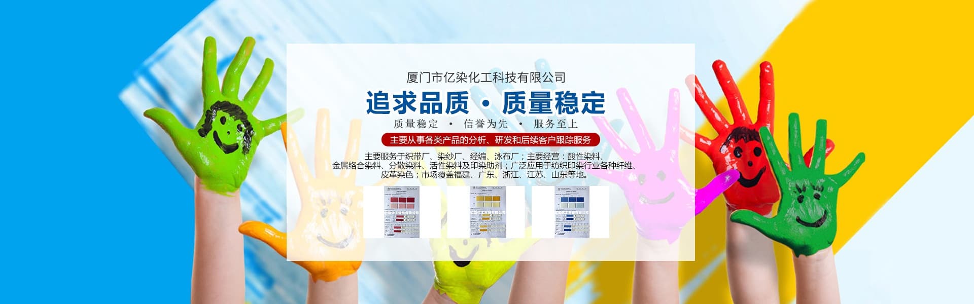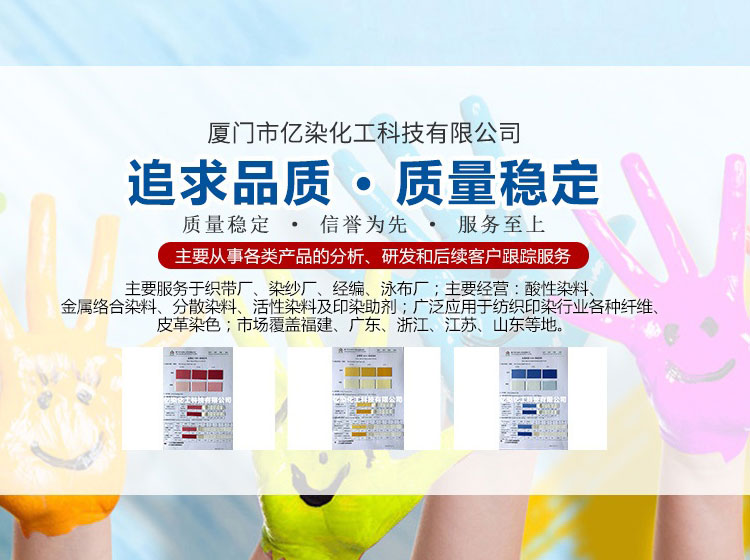 廈門市億染化工科技有限公司是一家集研發(fā)、生產(chǎn)、銷售一體的綜合型企業(yè)。公司主要經(jīng)營:酸性染料、金屬絡(luò)合染料、高牢度分散染料及印染助劑。公司信守“以誠信贏合作、以質(zhì)量贏市場、以創(chuàng)新贏發(fā)展、以服務(wù)贏生存”的企業(yè)精神服務(wù)于廣大客戶,多年以來建立了良好的市場口碑,市場遍布福建、廣東、浙江、江蘇、山東及東南亞國家,與多家知名企業(yè)建立了長期合作伙伴關(guān)系!